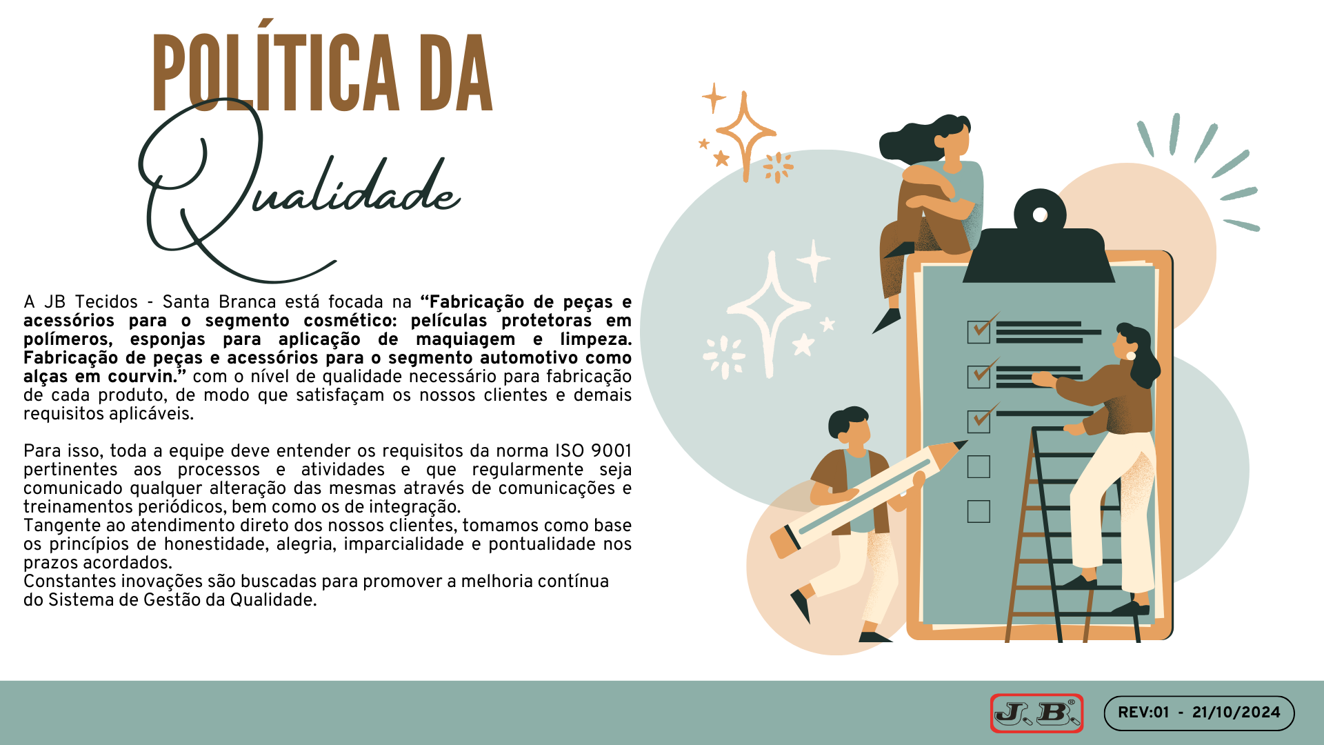 Na JB Tecidos, nossa Política de Qualidade segue rigorosamente a ISO 9001:2015, reforçando nosso compromisso com a excelência.
